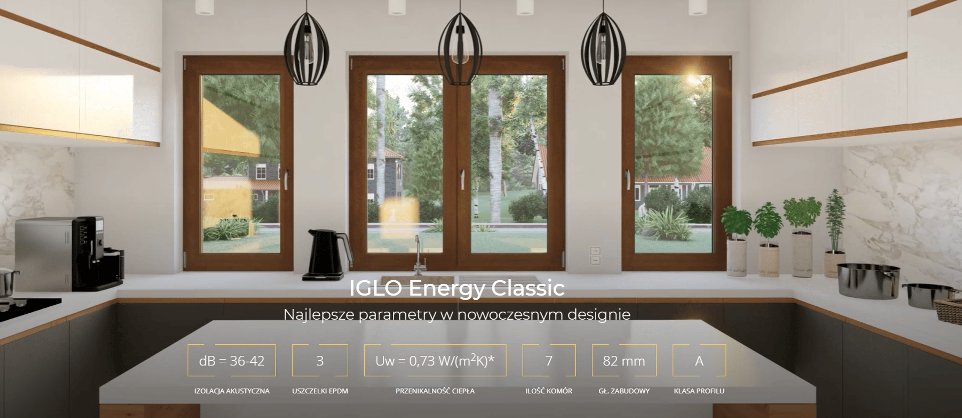 Unikalny design z możliwością wyboru kanciastej listwy przyszybowej wpisującej się w najnowsze trendy architektoniczne. Za rewelacyjne parametry izolacji cieplnej odpowiada optymalna 7-komorowa budowa profilu, specjalnie zaprojektowany system uszczelnienia ze spienionego EPDM oraz pakiety szybowe o wysokich parametrach izolacji termicznej. Wyposażenie standardowe: